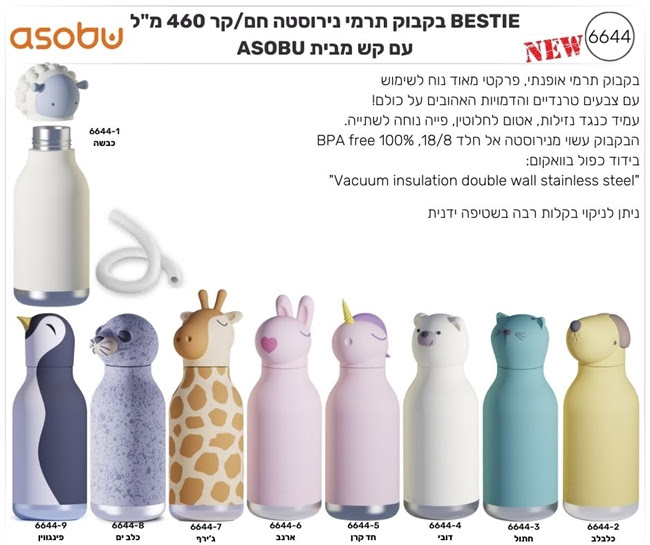 בקבוק תרמי אסובו אופנתי, פרקטי מאוד נוח לשימוש עם צבעים אופנתיים וטרנדיים.