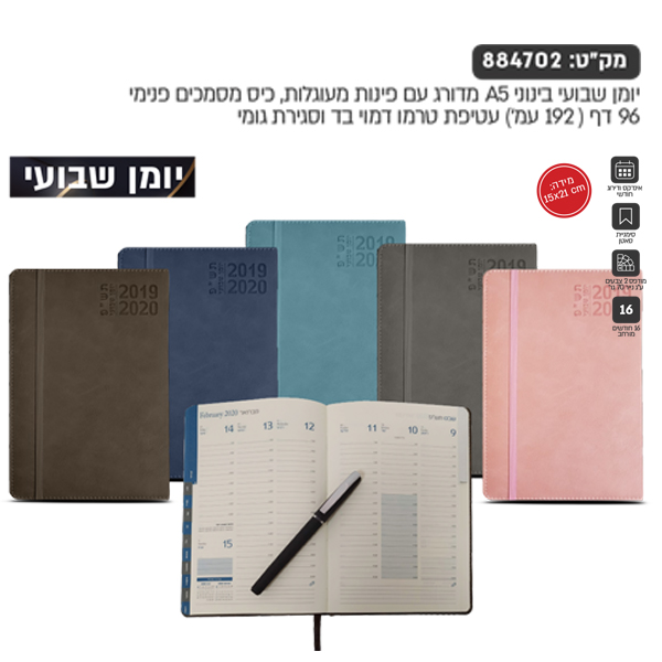 גודל A5, פינות מעוגלות, כיס מסמכים פנימי
