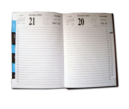 | חלוקת זמן: | שורה לכל חצי שעה. עמוד לכל יום. |