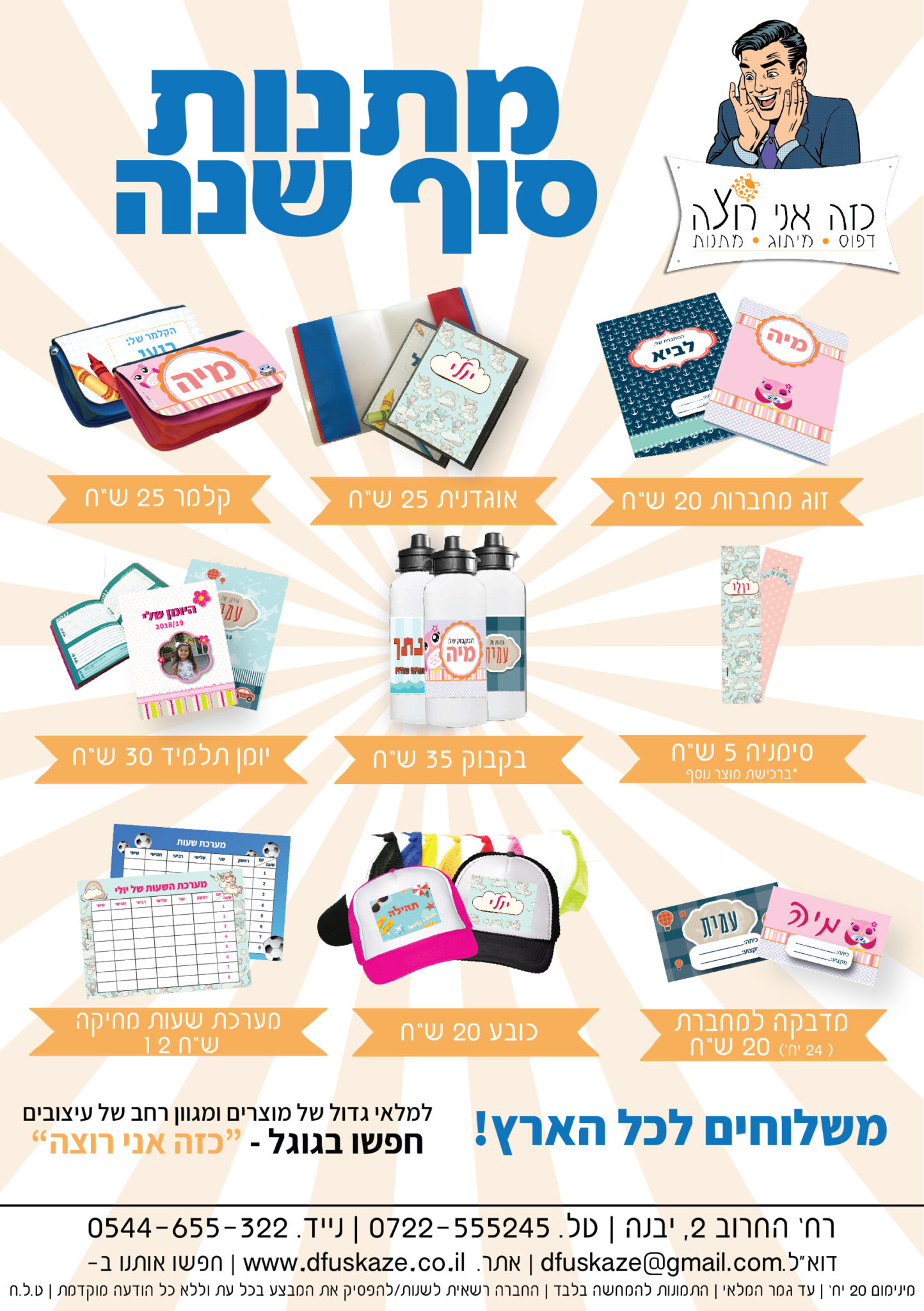 שימו לב, המחירים באתר הם כלליים בלבד ולא כוללים מע"מ ולא כוללים הדפסה אלא אם כן צויין אחרת. יש לברר טלפונית מחיר לכל כמות וסוג של הדפסה.