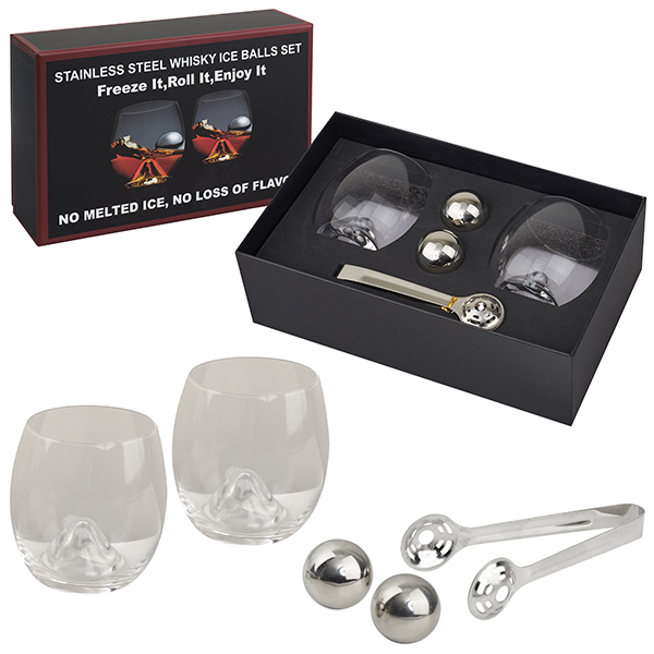 סט מתנה ויסקי – שתי כוסות עם כדורי קרח ממתכת